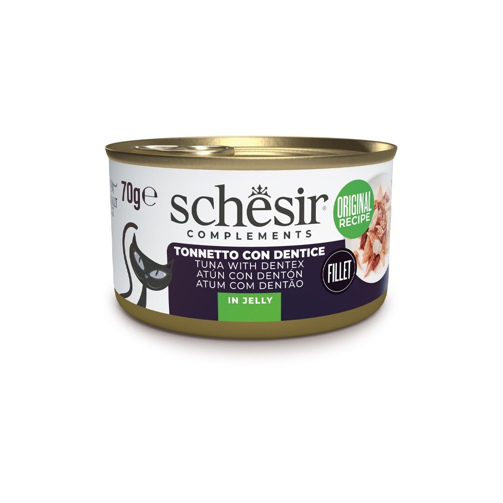 Schesir Cat Complements si basa su ingredienti 100% naturali, impiegando filetti di tonno e dentice, per un apporto proteico di qualità; cotti al vapore e lavorati a mano, garantiscono la massima conservazione del valore nutrizionale degli ingredienti.