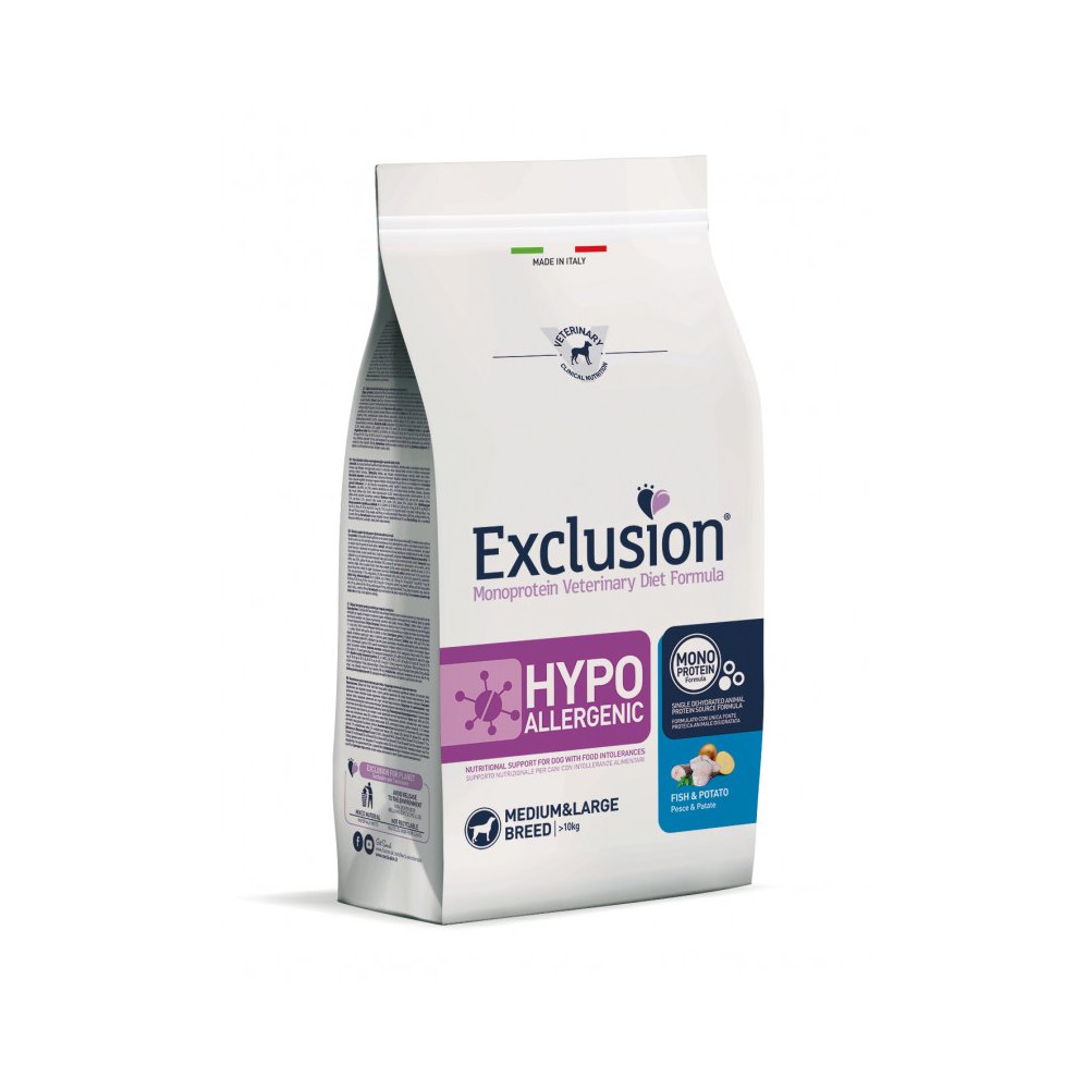 Exclusion Monoprotein Veterinary Diet Formula Hypoallergenic è un alimento dietetico con formulazione monoproteica, realizzato con un unica fonte alternativa di proteine animali, ingredienti innovativi e preservato con tocoferoli naturali; rappresenta la risposta nutrizionale a disposizione del Veterinario, differenziata per taglia, come supporto nutrizionale per cani con intolleranze alimentari. Formulato per la riduzione di intolleranze a ingredienti e a sostanze nutritive, questo alimento completo dietetico possiede fonti selezionate di proteine e carboidrati.