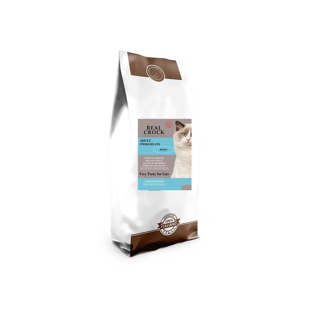 REAL CROCK PREMIUM Cat Sterilizzato al Pesce è un alimento secco completo per gatti adulti sterilizzati, calibrato sulle necessità alimentari del gatto adulto sterilizzato.