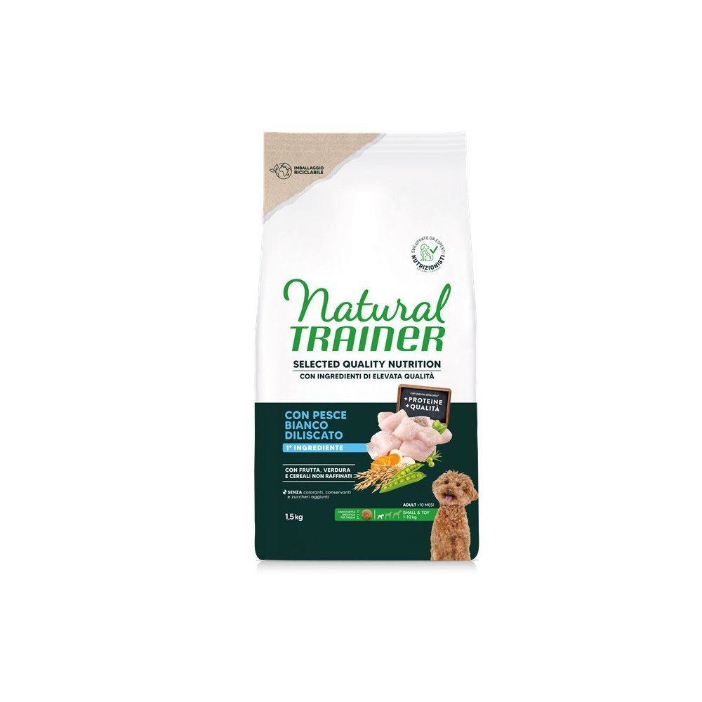 Natural Trainer è un brand che si impegna a offrire alimenti di alta qualità per cani e gatti, offrendo anche un approccio attento alle esigenze nutrizionali individuali, garantendo ai tuoi amici pelosi una dieta sana e gustosa. La gamma Natural Trainer Selected Quality Nutrition è pensata per garantire al tuo amico a quattro zampe un'alimentazione di primissima qualità, senza coloranti, conservanti e zuccheri aggiunti: - CON PESCE BIANCO DILISCATO Pesce di alta qualità, preparato fresco e surgelato. Contribuisce ad una migliore digeribilità e nutrizione. - CON CEREALI NON RAFFINATI COME RISO INTEGRALE, ORZO E AVENA che forniscono fibre che contribuiscono ad una corretta digestione. - CON CAROTA, MELA, ROSMARINO E ALGA KELP come fonte di fibre e sostanze minerali.