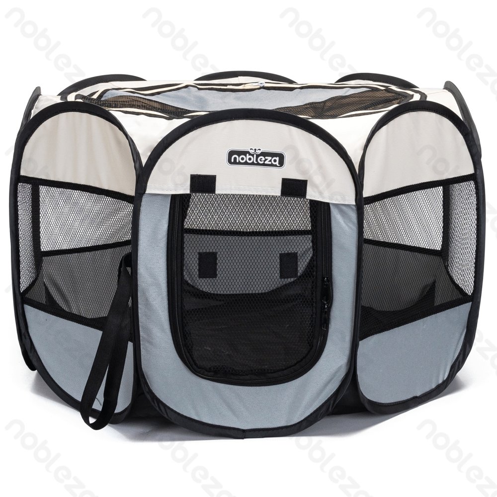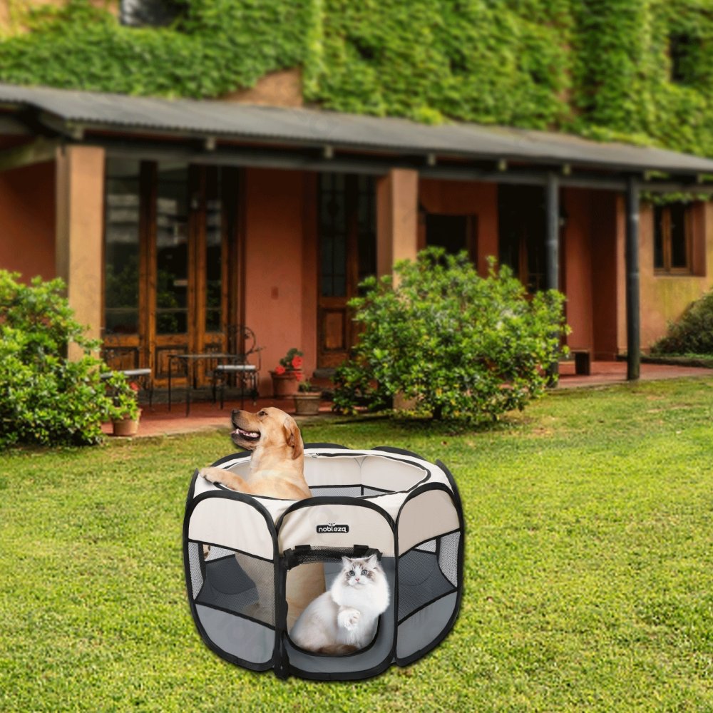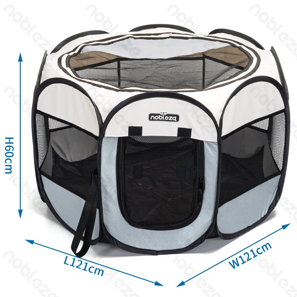 Pronto all'uso e facile da montare.; Mantiene gli animali domestici al sicuro sia all'interno che all'esterno. Dimensioni ridotte una volta piegato, facile da riporre e trasportare, leggero e portatile. La mezza copertura in rete con cerniera protegge gli animali domestici dal sole e consente una facile visione. Dotato di 4 picchetti che possono essere fissati al terreno del parco o del patio.