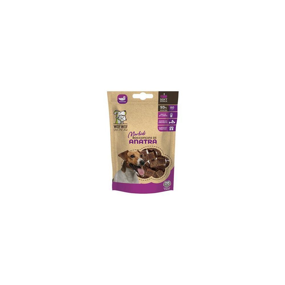 I Bocconcini di Anatra WOFWOF sono uno snack naturale e appetitoso pensato per soddisfare il palato del tuo cane in modo sano e gustoso.